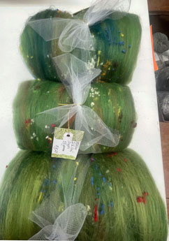 These textural batts are a blend of five colors of Merino, multi-colored Nepps and green Silk Noil. I have used batts like these to make a grassy meadow with wildflowers in a wet-felted landscape. Use PreFelt as your landscape backing or create your own. Merino will wet-felt very well. These batts would also make an interesting hand spun yarn.