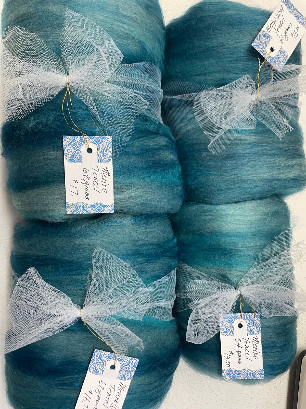 Three shades of gorgeous Teal wool– light, medium and dark Merino with teal Tencel make a beautiful batt. Hand-spin it or wet-felt with it. The fibres are blended and carded into a stripey mixture of color. Tencel is the shiniest fibre we have.