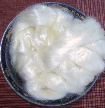 Tussah Silk is a beautiful fibre with the sheen you know from pure silk. It is extremely soft and fine, with all the luxurious qualities of good silk. “Top” is fibre that has been combed. The fibres are parallel and the impurities removed to leave only the best. This silk is extra-bleached white color.